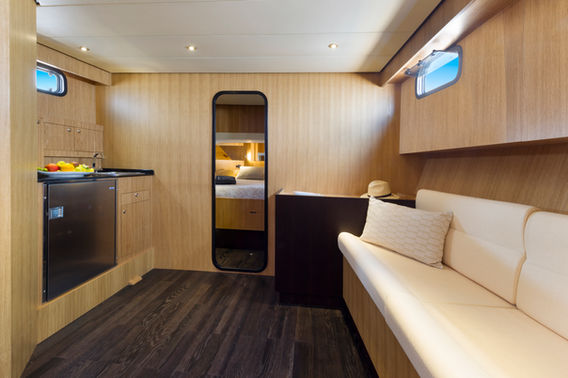 Lounge, bathroom with shower and master cabin are below deck.